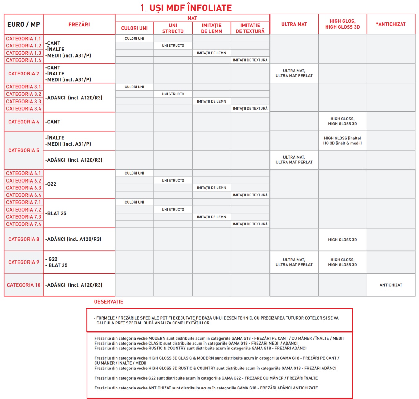 – CATEGORIE DE PREȚURI VALABILA DIN 2020 PANA LA RETRAGERE (vezi imaginea alaturata: 1. USI MDF INFOLIATE)