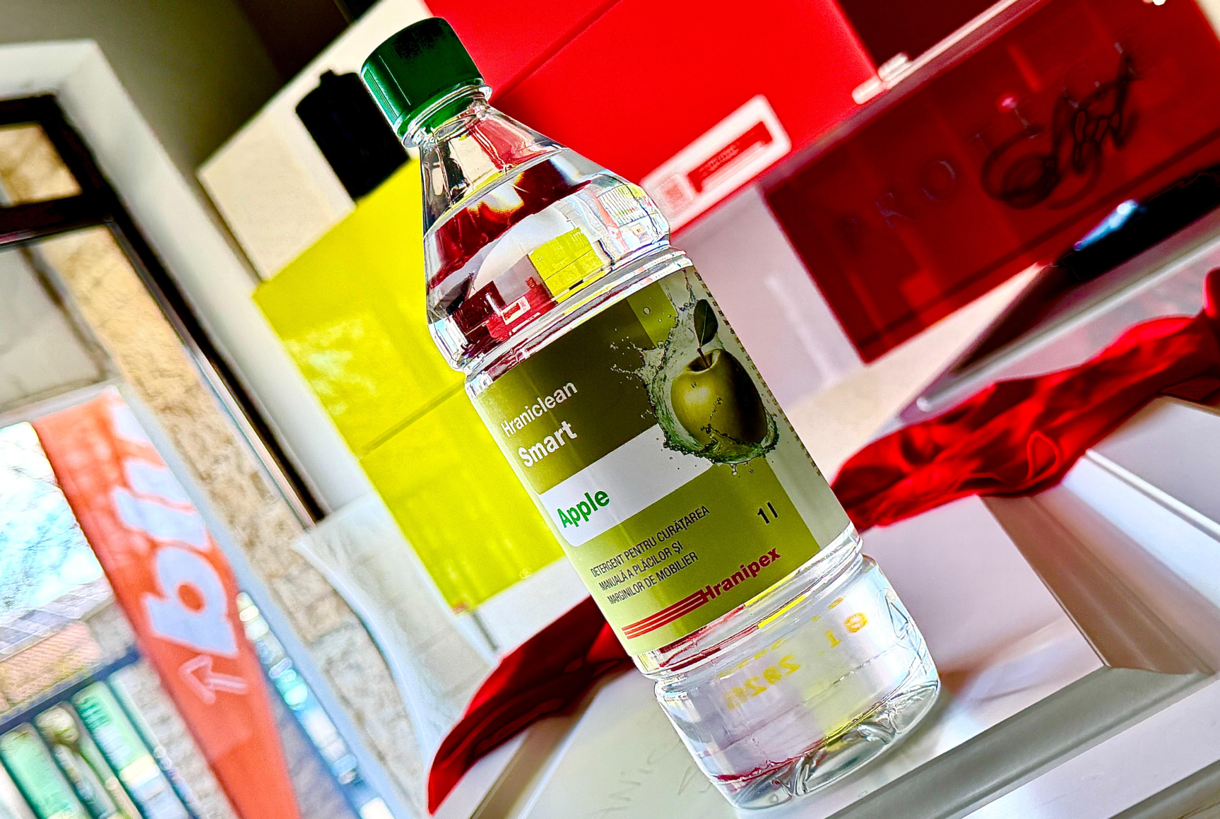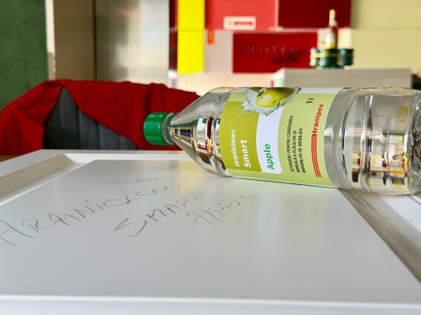 Hraniclean Smart Apple este făcut exact pentru locurile astea: să curețe bine urmele de adeziv, marker, pix, creion sau scotch, să se usuce rapid, să nu lase urme de grăsimi și să lase în urmă o suprafață curată, cu un plus plăcut de miros de măr.