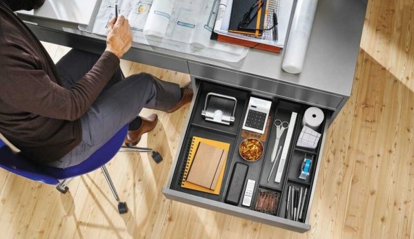 Sistemele modulare AMBIA-LINE Blum pentru sertare BOX (laterale metalice) ELEGANTE de la Blum (LEGRABOX si MERIVOBOX) permit organizarea eficientă a fiecărui sertar, astfel încât să poți avea totul la îndemână într-un mod ordonat. Datorită acestor soluții ingenioase de feronerie premium de la Blum Austria, mobilierul de birou mobil nu este doar un spațiu de lucru eficient, ci și o piesă de mobilier estetică și mai mult decat practică.