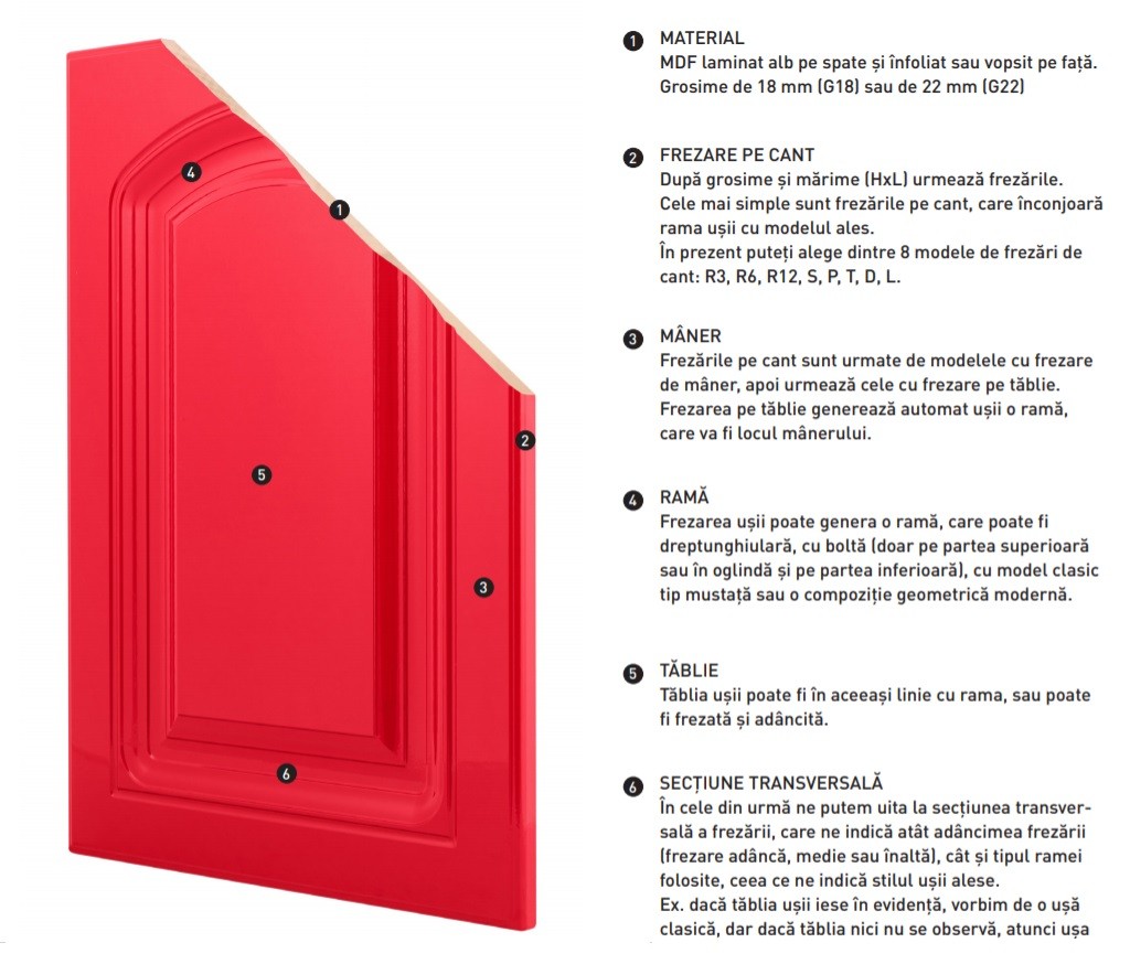 MDF-ul utilizat in productia de fete de usi, fronturi de sertar sau accesorii are doua grosimi: 18 mm (G18) sau 22 mm (G22).