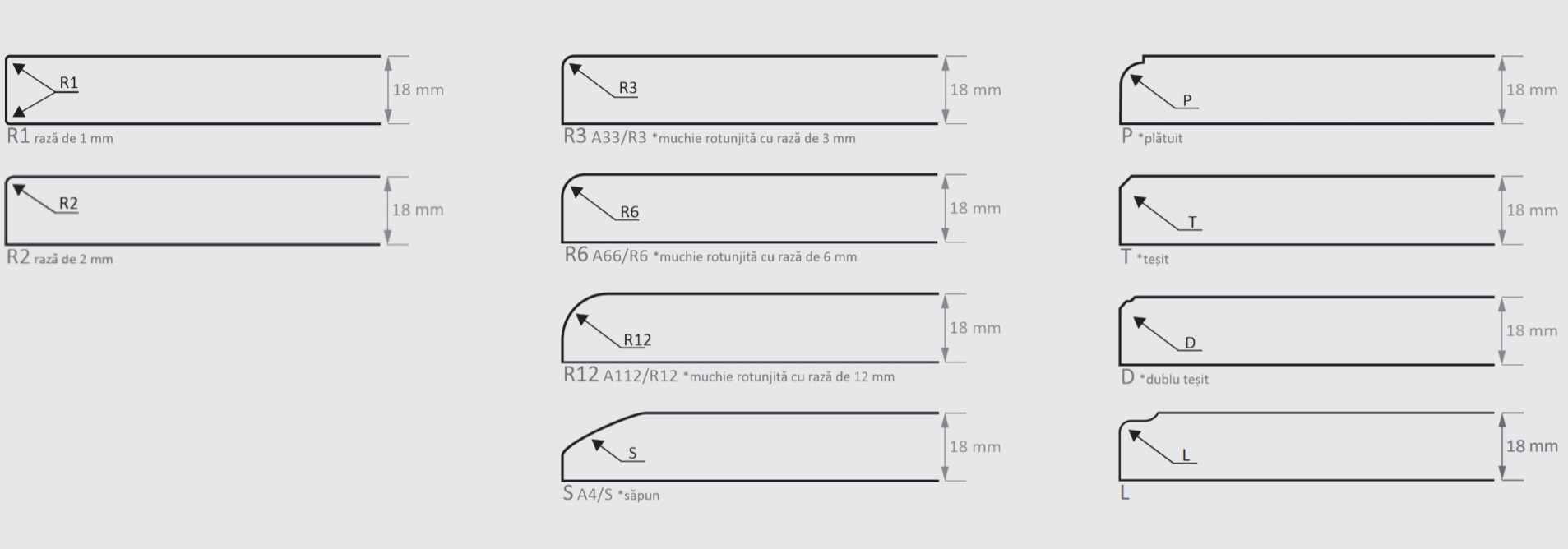 3.1 Pentru grosime MDF de 18 mm(G18): A12/R6, A23/R6, A30/R6, A40/T, A41/T, A42/T, A43/T, A49/SR3, A50/SR3, A57/R6, A58/R6, A101/R6, A102/R6, A103/R6, A120/R3, A140/L, A143/L, A144/L.